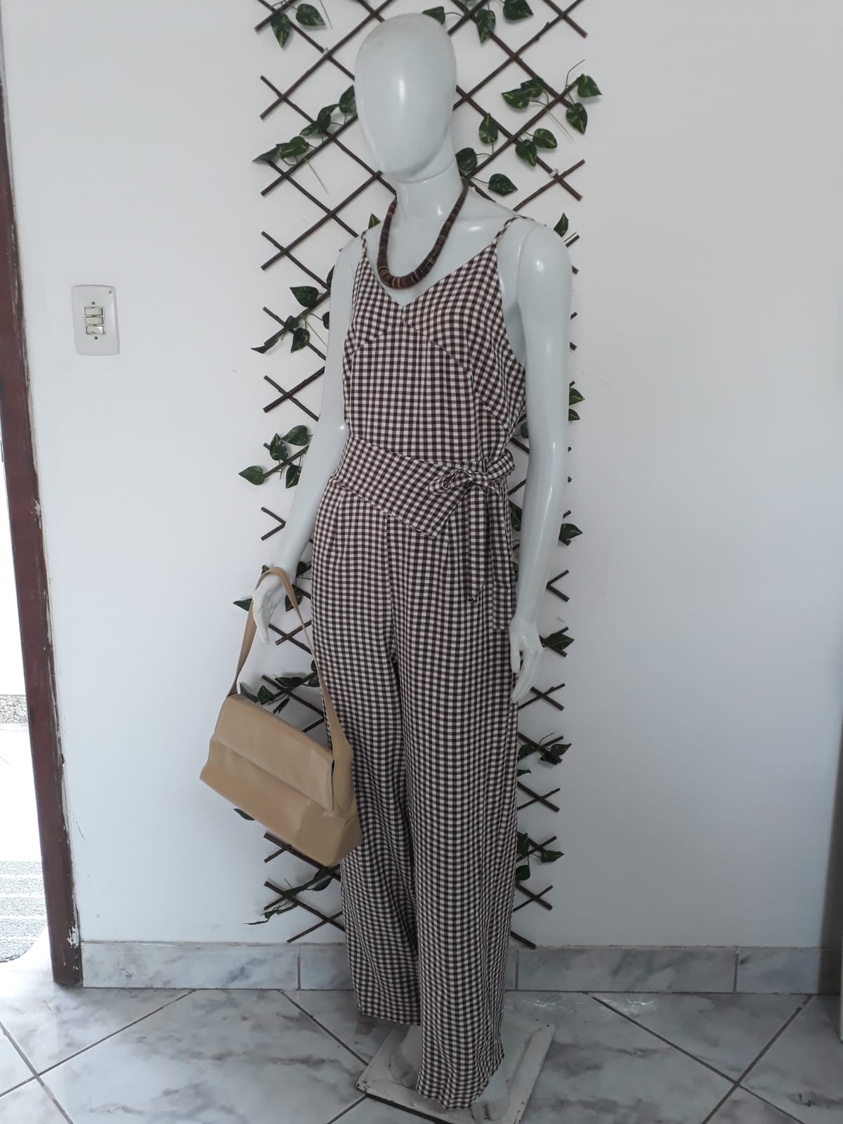 Macacão em xadrez vichy, em poliéster, tem forro no busto, com bolsos, e fecho nas costas
